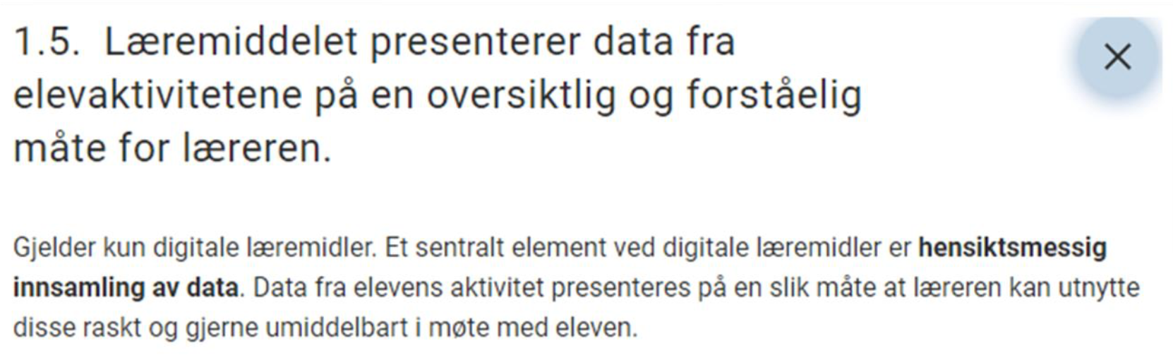 Dette er eitt eksempel fra disse kvalitetskriteriene som indikerer at det er ønskelig at digitale læremidler lagrer elevenes aktivitetsdata og tilgjengeliggjør disse for læreren umiddelbart: