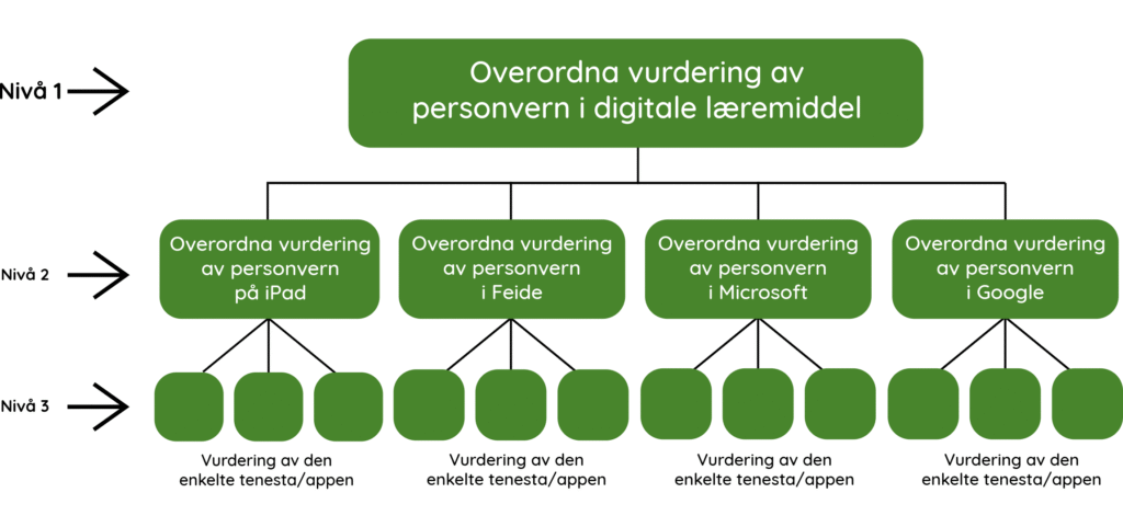 I Ryfylkeskulen gjennomfører me vurderingar av personvern i digitale læremiddel på tre ulike nivå: